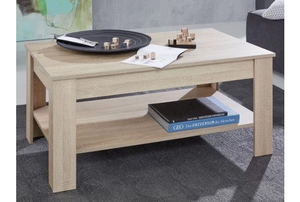 Jednoduché univerzální tvary se hodí do každého obýváku – konferenční stolek s pevnou konstrukcí a prostornou odkládací přihrádkou dobře poslouží u moderní i klasické sedačky. Vyroben v dekoru dub sonoma.