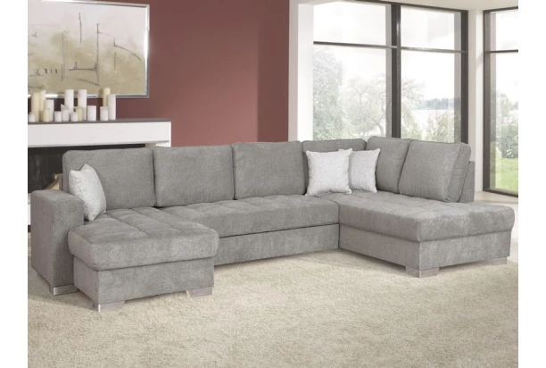 Prostorná sedací souprava ve tvaru U nabízí příjemně měkký komfort pro celou rodinu, velké stabilní polštáře i kvalitní zpracování. Očalouněna šedou látkou a doplněna 3 polštářky. Varianta sedačky bez funkce rozkladu a úložného prostoru.