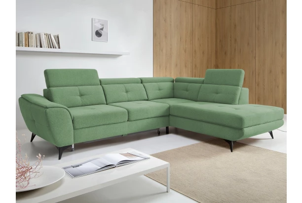 Rohová sedací souprava Sergio – spojení moderního vzdušného designu, příjemného pohodlí a praktických vlastností, které potěší každý den. Polohovatelné opěrky, úložný prostor pod otomanem i rozkládací funkci na lůžko oceníte. Očalouněna látkou v odstínu bledě zelená se zvýšenou odolností proti vlhkosti. Sedačka s bočním otomanem vytváří pravý roh.