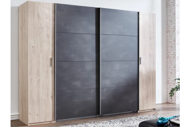 Moderní šatní skříň Lotto zaujme kombinací posuvných a otočných dveří. Oceníte prakticky řešený vnitřní prostor, kde najdete policový systém i závěsné tyče. Vyrobena v kombinaci dub hickory/imitace antracitová broušená ocel.