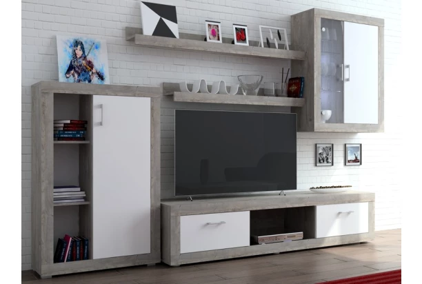 Oblíbená obývací stěna v kombinaci dřevodekoru dub ribbeck a bílé barvy snadno pasuje do mnoha interierů a praktické spojení úložných prostor s přihrádkami využijete každý den.