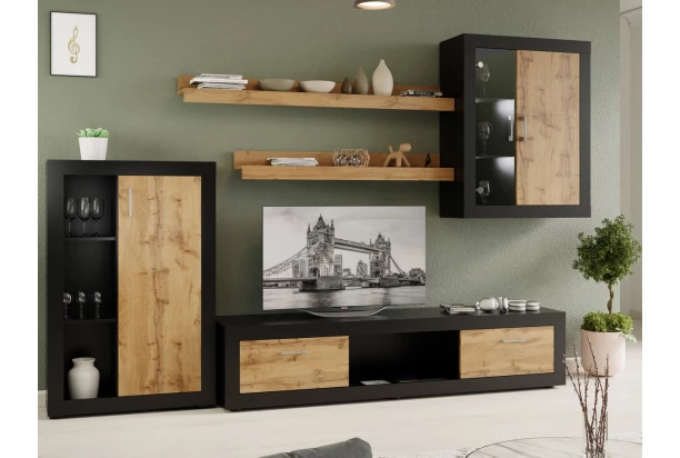Oblíbená obývací stěna v kombinaci černá s dřevodekorem dub wotan snadno pasuje do mnoha interierů a praktické spojení úložných prostor s přihrádkami využijete každý den.