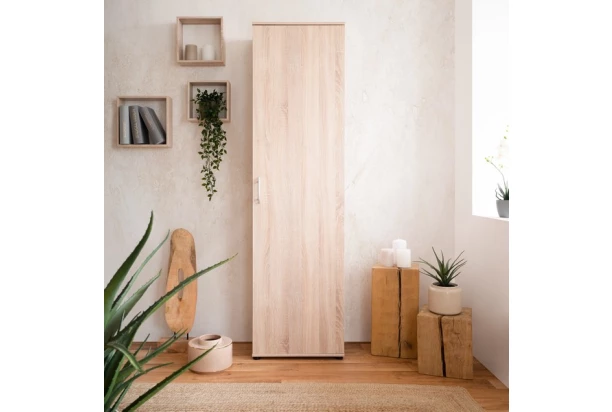 Skříň o celkové šířce 50 cm v dekoru dub sonoma najde univerzální využití v každé Vaší domácnosti. Za otočnými dveřmi najdete úložný prostor s 5 policemi, které můžete výškově nastavovat. Skříň se tak snadno přizpůsobí Vašim potřebám a rozměrově se hodí i do malého prostoru.