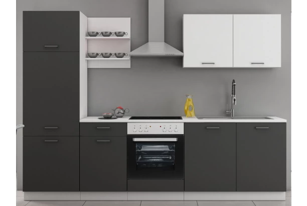 Praktická kuchyňská linka o celkové šířce 270 cm pasuje do téměř jakéhokoliv kuchyňského prostoru – v univerzální kombinaci bílá/šedá. Jednotlivé skříňky lze mezi sebou libovolně kombinovat a poskládat si tak kuchyni podle vlastní potřeby. Tento kuchyňský blok je dodáván včetně pracovní desky.