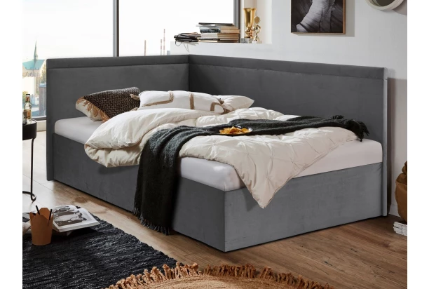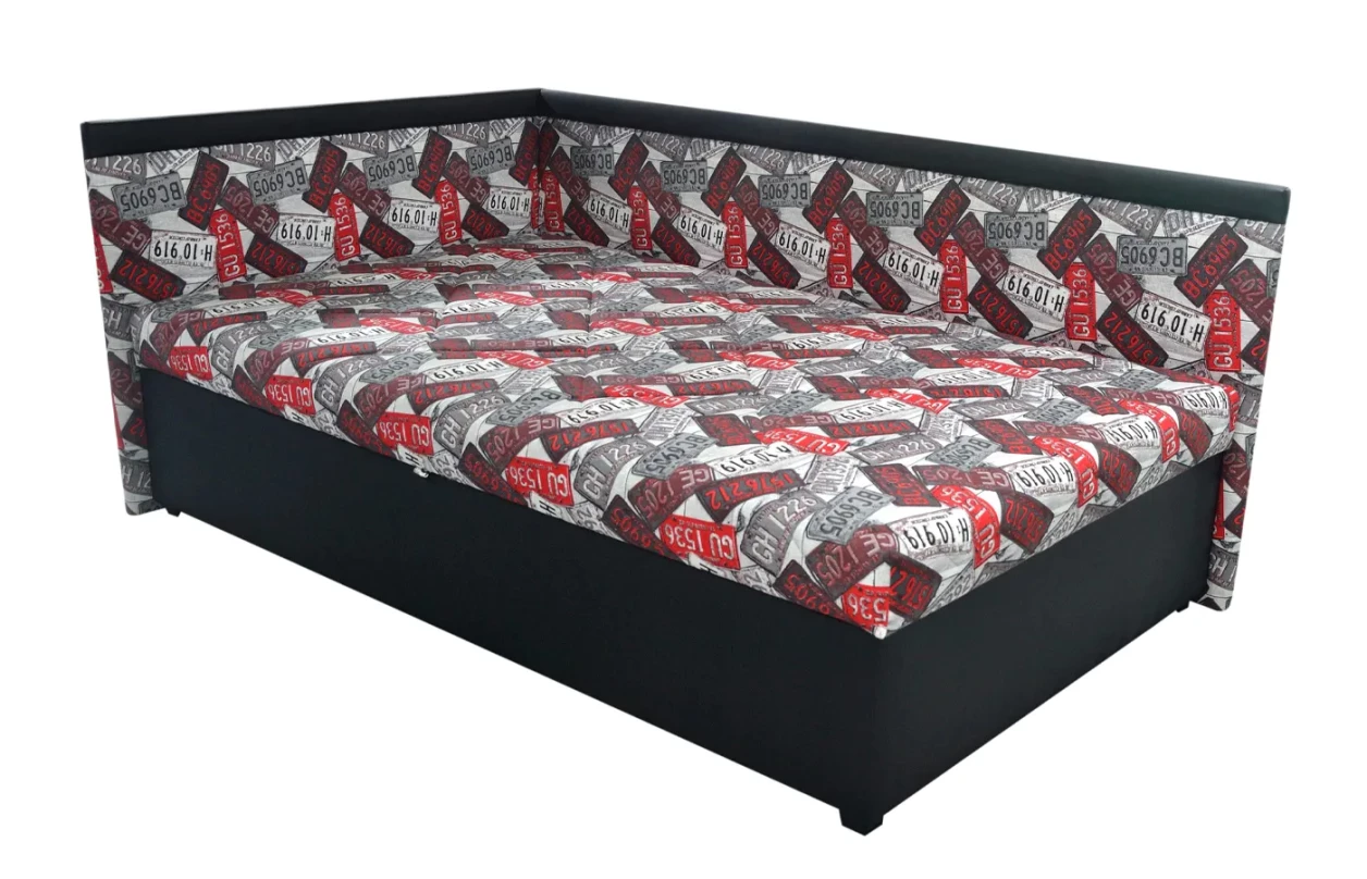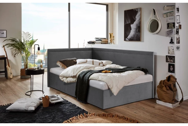Rohová postel s praktickou boční stěnou je vybavena matrací, lamelovým roštem i úložným prostorem. Levá varianta, očalouněna kombinací šedé látky a tkaniny se vzorem.