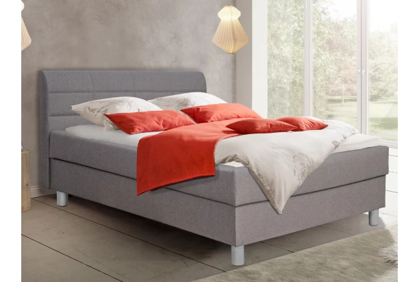 Postel s plochou lůžka 140×200 cm má zaoblené prošité čelo a je ideální i do menšího prostoru ložnice. Obsahuje matraci s roštem i úložný prostor v dolní části. Očalouněna tkaninou šedo-béžovém odstínu.
