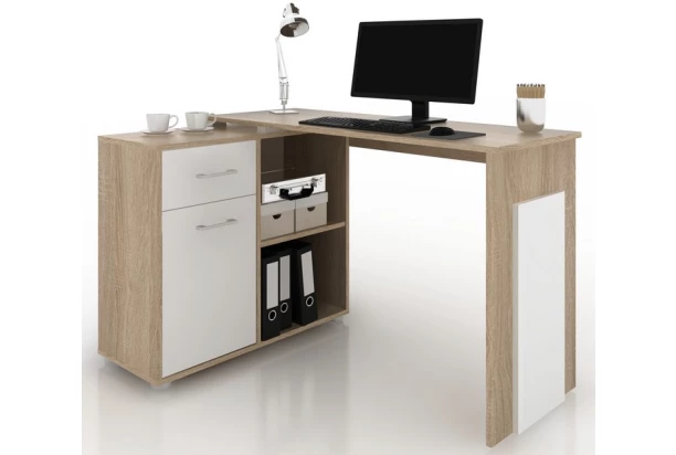 Rohový psací stůl můžete libovolně sestavit s regálem umístěným vpravo anebo vlevo. Stůl tak můžete snadno umístít do jakéhokoliv koutu místnosti. Vyroben v kombinaci dub sonoma/bílý mat.