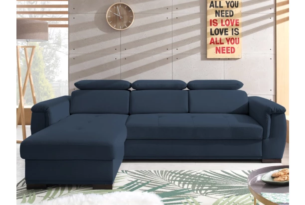 Trendová sedací souprava si Vás získá příjemně měkkým komfortem. Rohová sedačka nabízí polohovatelné zádové opěrky pro každodenní pohodu a boční otoman pro chvíle relaxace. U sedačky využijete i rozkládací funkci a úložný prostor pod otomanem. Očalouněna odolnou látkou v barvě námořnická modrá. Sedačka tvoří levý roh.