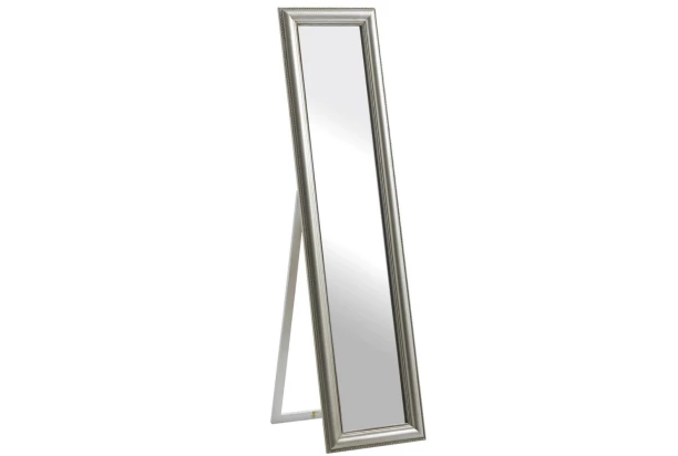 Elegantní stojací zrcadlo s okrasným stříbrným rámem dodá noblesní atmosféru v obýváku nebo ložnici a zároveň opticky zvětší okolní prostor.