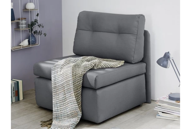 Praktické křeslo s rozkládací funkcí na lůžko pro hosty poslouží v každé domácnosti. Očalouněno šedou tkaninou. Oceníte snadné rozkládání a pohodlné ležení díky polstrování z polyuretanové pěny na dřevěných lamelách v bederní oblasti. Integrovaný úložný prostor v dolní části poslouží například pro uschování ložního prádla. Díky očalouněné zadní části lze umístit kdekoliv v místnosti. Součástí je i zádový polštář.