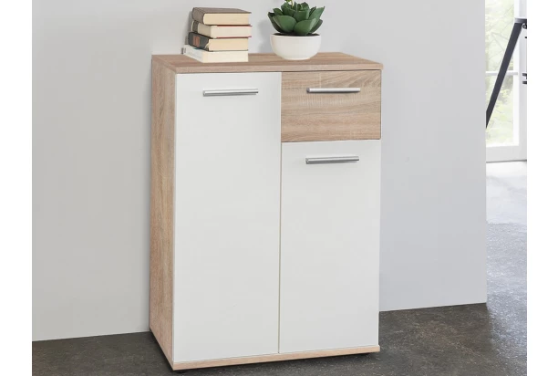 Skříňka se zásuvkou ze řady Jacky – univerzální komoda, která poslouží prakticky ať již v obýváku, ložnici anebo jakékoliv šatně. Vyrobena v kombinaci dub sonoma/bílá.