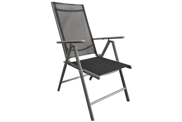 Moderní zahradní křeslo s kovovou konstrukcí, područkami a funkcí polohovatelného opěradla. Sedací části z černé umělé tkaniny.