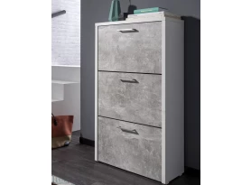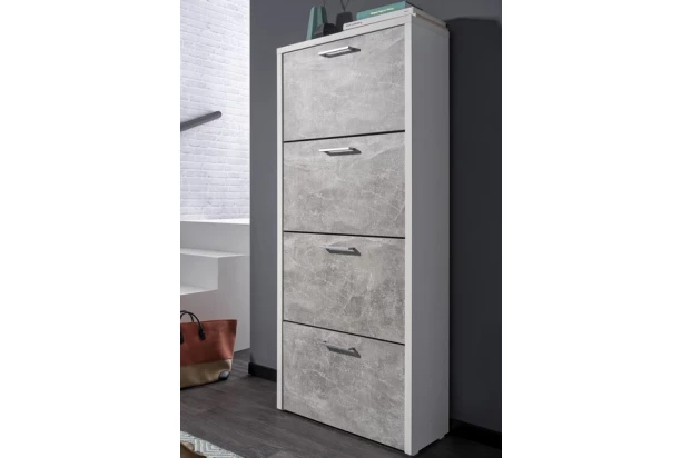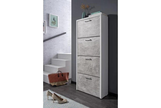 Moderní botník o výšce 152 cm nabízí 4 výklopné dveře s přihrádkami na boty. Široký rám botníku v bílé barvě doplňuje imitace šedého betonu na předních plochách.