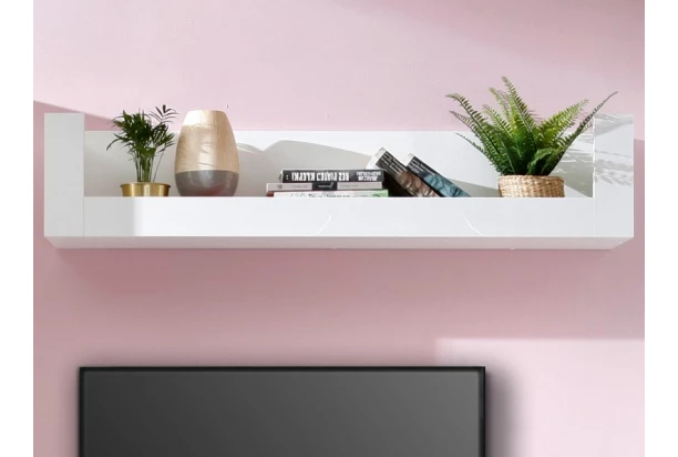 Nástěnná police o celkové šířce 120 cm z programu Bergen – bílý nábytek s lesklou přední lištou vytváří zajímavou optiku. Z jednotlivých elementů můžete snadno zařídit jakýkoliv pokoj a dodat Vašemu bytu stylovou atmosféru.