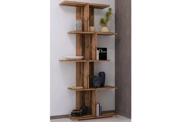 Vysoký regál má zajímavou členitou konstrukci ve vintage optice dřevěných prken a poslouží ideálně pro dekorace i knížky. Použitím více regálů vedle sebe můžete vytvářet zajímavé kompozice.
