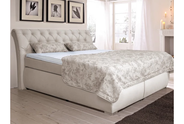Komfortní vysoká postel typu boxspring o velikosti lůžka 180×200 cm v noblesním glamour stylu. Elegantně zaoblené čelo s okrasnými knoflíky a krémová potahová látka s nařasením působí luxusně na pohled. Dvě vrstvy kvalitních matrací zajistí optimální oporu, příjemné uvolnění a komfortně měkké spaní.