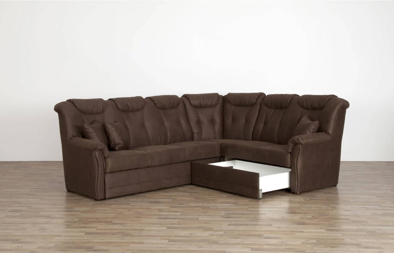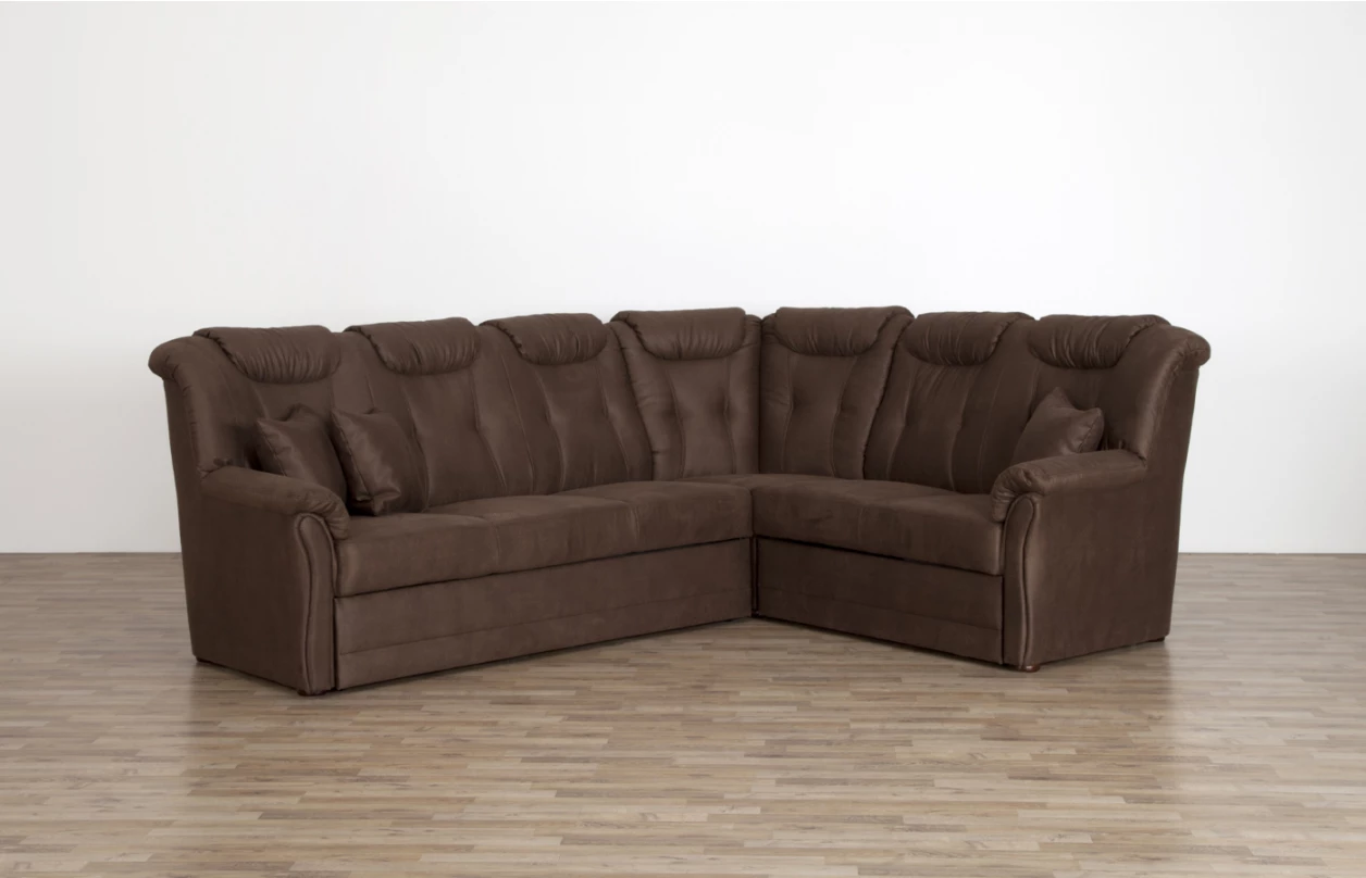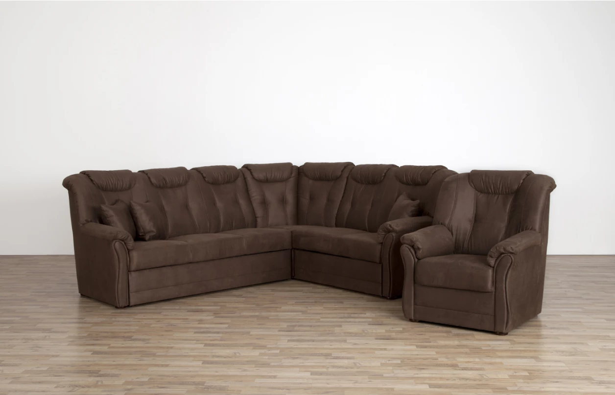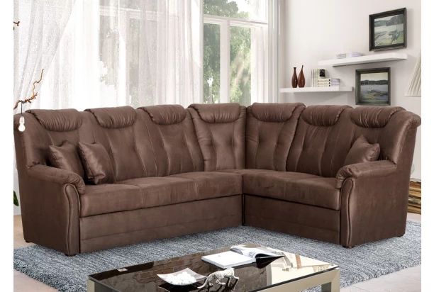Rohová sedací souprava v klasickém elegantním stylu pro všechny, kdo sází na kvalitu a zároveň vysokou míru pohodlí. Sedačka očalouněna hnědou látkou v zajímavé optice kůže a doplněna dekorativním proševem. Varianta sedačky bez funkce rozkladu a zásuvky.