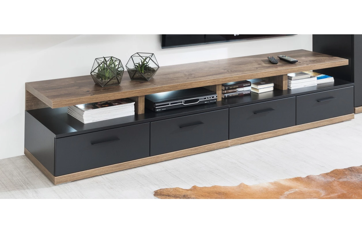 Chcete-li kvalitní a zároveň moderní designový nábytek, pak je široká komoda Boston právě pro vás. Horní rámy obsahují bodová LED světla, která na strukturovaném povrchu nábytku hrají hru světla a stínů a vytváří tak opravdu exkluzivní efekt. Nábytek zároveň zůstává účelný a praktický. Komoda vyrobena v kombinaci matně černé barvy a útulného dřevodekoru dub ribbeck.