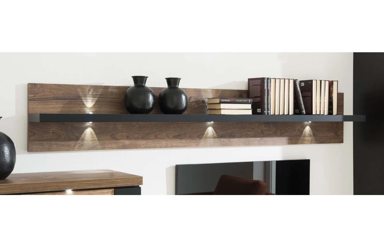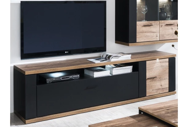 Chcete-li kvalitní a zároveň moderní designový nábytek, pak je široká TV skříňka Boston právě pro vás. Horní rám obsahuje bodové LED světlo, které na strukturovaném povrchu nábytku hraje hru světla a stínů a vytváří tak opravdu exkluzivní efekt. Nábytek zároveň zůstává účelný a praktický. Televizní skříňka je vyrobena v kombinaci matně černé barvy a útulného dřevodekoru dub ribbeck.