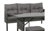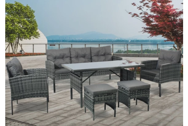 Komfortní set zahradního nábytku z imitace ratanu obsahuje jídelní stůl, lavici dvě křesla a dva taburety. Včetně sedacích a opěrných polštářů pro příjemné pohodlí s rodinou nebo přáteli.