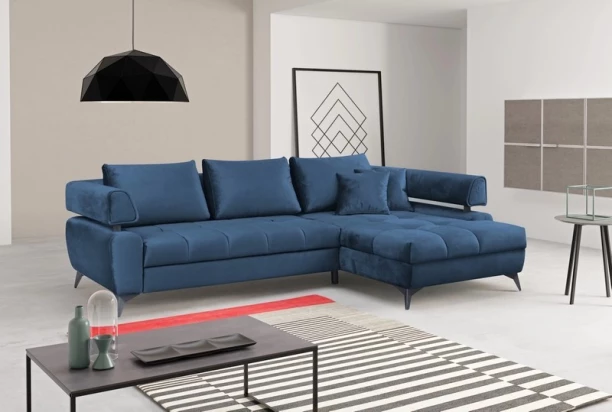 Atraktivní rohová sedací souprava Paris je nejen pohodlná, ale i zajímavá na pohled. Vzdušný design tvarů dotváří velké polštáře, moderní kovové nohy, dekorativní prošev a prostorný otoman. Sedačka tvoří pravý roh a je očalouněna kvalitní látkou v optice lesklého sametu v odstínu modrá. Potěší i z praktické strany, díky úložnému prostoru a rozkládací funkci na příležitostné lůžko.