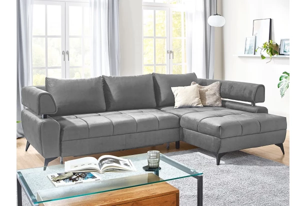 Atraktivní rohová sedací souprava Paris je nejen pohodlná, ale i zajímavá na pohled. Vzdušný design tvarů dotváří velké polštáře, moderní kovové nohy, dekorativní prošev a prostorný otoman. Sedačka tvoří pravý roh a je očalouněna kvalitní látkou v sametové lesklé optice v odstínu středně šedá. Potěší i z praktické strany, díky úložnému prostoru a rozkládací funkci na příležitostné lůžko.