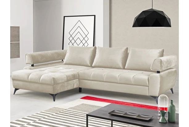 Atraktivní rohová sedací souprava Paris je nejen pohodlná, ale i zajímavá na pohled. Vzdušný design tvarů dotváří velké polštáře, moderní kovové nohy, dekorativní prošev a prostorný otoman. Sedačka tvoří levý roh a je očalouněna kvalitní látkou v optice lesklého sametu v odstínu krémová. Potěší i z praktické strany, díky úložnému prostoru a rozkládací funkci na příležitostné lůžko.