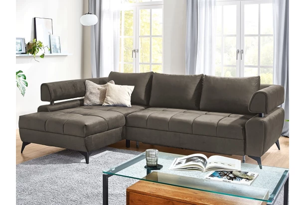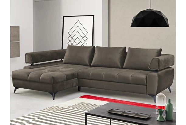 Atraktivní rohová sedací souprava Paris je nejen pohodlná, ale i zajímavá na pohled. Vzdušný design tvarů dotváří velké polštáře, moderní kovové nohy, dekorativní prošev a prostorný otoman. Sedačka tvoří levý roh a je očalouněna kvalitní látkou v optice lesklého sametu v odstínu blátivá hnědá. Potěší i z praktické strany, díky úložnému prostoru a rozkládací funkci na příležitostné lůžko.