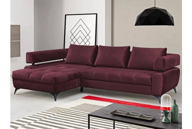 Atraktivní rohová sedací souprava Paris je nejen pohodlná, ale i zajímavá na pohled. Vzdušný design tvarů dotváří velké polštáře, moderní kovové nohy, dekorativní prošev a prostorný otoman. Sedačka tvoří levý roh a je očalouněna kvalitní látkou v optice lesklého sametu v odstínu vínová. Potěší i z praktické strany, díky úložnému prostoru a rozkládací funkci na příležitostné lůžko.