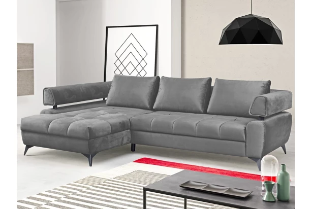 Atraktivní rohová sedací souprava Paris je nejen pohodlná, ale i zajímavá na pohled. Vzdušný design tvarů dotváří velké polštáře, moderní kovové nohy, dekorativní prošev a prostorný otoman. Sedačka tvoří levý roh a je očalouněna kvalitní látkou v optice lesklého sametu v odstínu středně šedá. Potěší i z praktické strany, díky úložnému prostoru a rozkládací funkci na příležitostné lůžko.