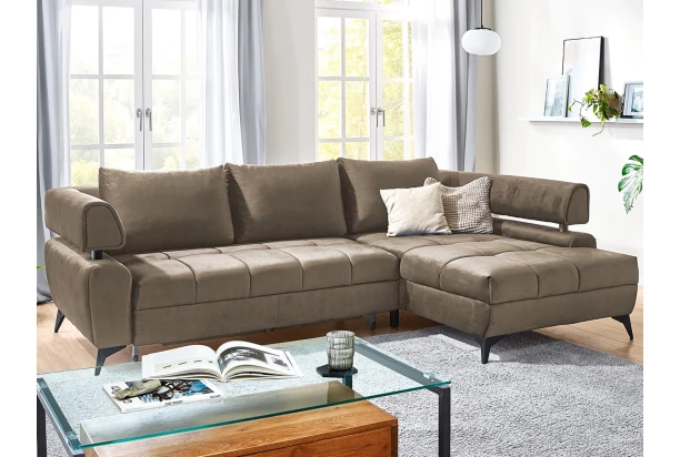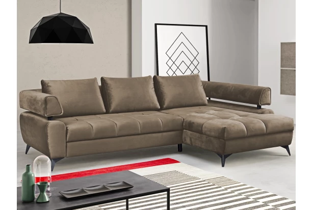 Atraktivní rohová sedací souprava Paris je nejen pohodlná, ale i zajímavá na pohled. Vzdušný design tvarů dotváří velké polštáře, moderní kovové nohy, dekorativní prošev a prostorný otoman. Sedačka tvoří pravý roh a je očalouněna kvalitní látkou v lesklé sametové optice v odstínu světle hnědá. Potěší i z praktické strany, díky úložnému prostoru a rozkládací funkci na příležitostné lůžko.