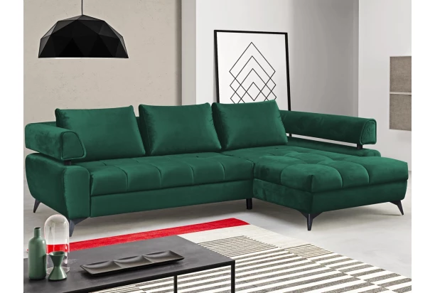 Atraktivní rohová sedací souprava Paris je nejen pohodlná, ale i zajímavá na pohled. Vzdušný design tvarů dotváří velké polštáře, moderní kovové nohy, dekorativní prošev a prostorný otoman. Sedačka tvoří pravý roh a je očalouněna kvalitní látkou v lesklé sametové optice v odstínu lahvově zelená. Potěší i z praktické strany, díky úložnému prostoru a rozkládací funkci na příležitostné lůžko.