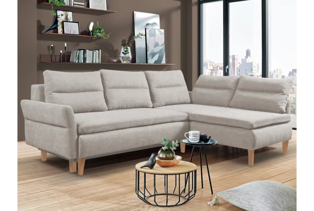 Rohová sedací souprava v trendovém stylu zaujme prošitím polštářů a bočních područek. Očalouněna příjemně měkkou látkou v odstínu béžová. Velikostně ideální sedačka do jakéhokoliv rohu obývacího pokoje, otoman můžete umístit libovolně na pravou nebo levou stranu. Navíc s funkcí rozkladu i úložným prostorem.