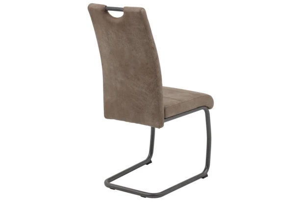 Moderní jídelní židle má zaoblený design, šedou konstrukci s praktickým madlem a komfortní sedák potažen béžovou látkou ve vintage optice.