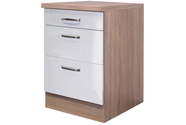 Dolní kuchyňská zásuvková skříňka o šířce 60 cm z elegantního kuchyňského programu Valero – útulnou kombinaci dekoru dub sonoma a bílé barvy ve vysokém lesku doplňuje zaoblený kovový úchyt v nerezovém provedení. Elementy kuchyňského programu Valero můžete mezi sebou libovolně kombinovat a sestavit si tak kuchyni podle vašich individuálních potřeb a prostorových možností.