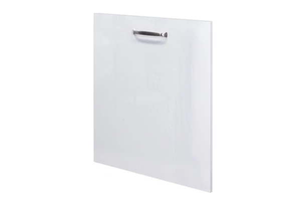 Přední krycí panel na vestavnou kuchyňskou myčku o šířce 60 cm z moderního kuchyňského programu Valero – bílý povrch ve vysokém lesku doplňuje zaoblený kovový úchyt v nerezovém provedení.