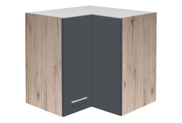 Horní rohová kuchyňská skříňka o šířce 60 cm z moderního kuchyňského programu Tiago – útulnou kombinaci dekoru dub san remo a šedé barvy doplňuje úchyt v šedém alu provedení. Elementy kuchyňského programu Tiago můžete mezi sebou libovolně kombinovat a sestavit si tak kuchyni podle vašich individuálních potřeb a prostorových možností.