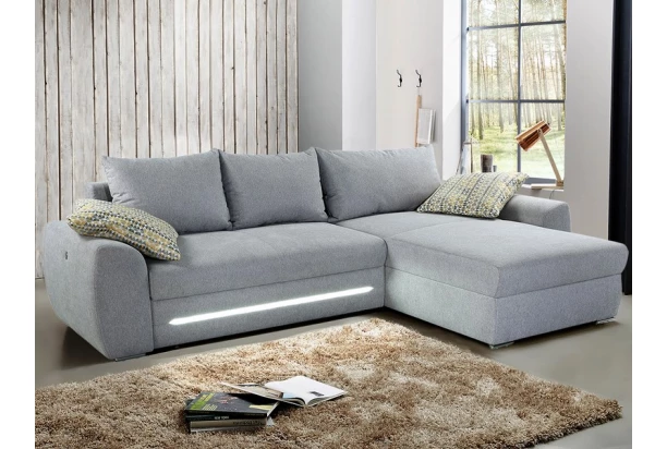 Pohodlná rohová sedací souprava s polštáři a integrovaným světelným LED pruhem, který skvěle doplní večerní atmosféru v moderním interieru. Úložný prostor pod sedákem je praktickým doplňkem a rozkládací funkci na lůžko ocení vaše návštěva. Moderní sedačka je očalouněna světle šedou tkaninou a doplněna polštářky se vzorem.
