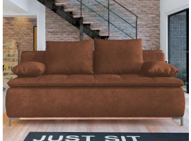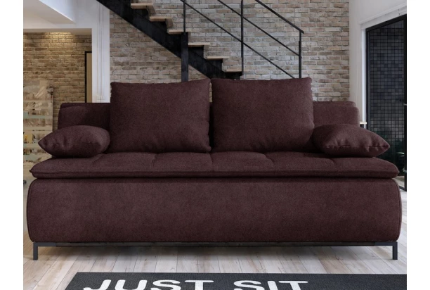Komfortně vypolstrovaná pohovka s velkými polštáři je vybavena rozkládací funkcí na lůžko, které můžete využít i pro běžné spaní. Očalouněna příjemně měkkou látkou v tmavě fialovém odstínu, doplněna proševem a kovovými nohami.