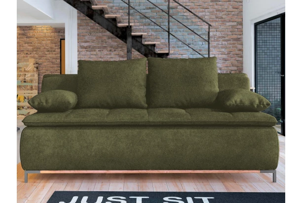 Komfortně vypolstrovaná pohovka s velkými polštáři je vybavena rozkládací funkcí na lůžko, které můžete využít i pro trvalé spaní. Očalouněna příjemně měkkou látkou v odstínu olivově zelená, doplněna proševem a kovovými nohami.