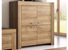 Vysoká vitrína z programu Sky – nábytek s optikou širokých rámů je vyroben v dřevodekoru dub riviera a vytvoří v každém interieru útulnou domáckou atmosféru.