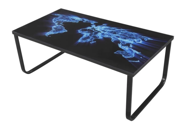 Moderní konferenční stolek na černé kovové podnoži má skleněnou desku s motivem modře podsvícené mapy světa.