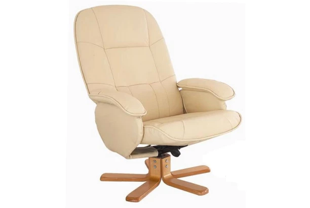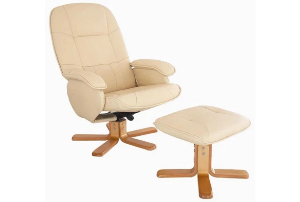 Pohodlné TV křeslo na dřevěné podnoži s možností polohování opěradla. Očalouněno krémovou ekokůží. navíc doplněno taburetem, který oceníte během relaxace.