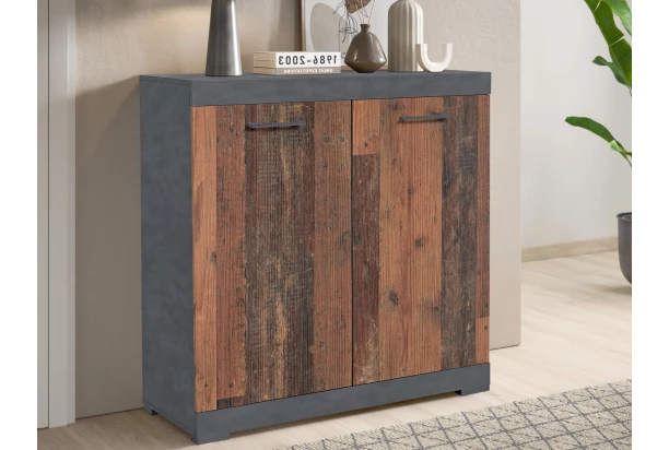 Skříňka o šířce 80 cm z řady Bristol je praktická a zároveň zaujme na pohled. V kombinaci imitace broušeného kovu s vintage optikou dřevěných prken – skvělé doplnění stylově zařízeného bytu.