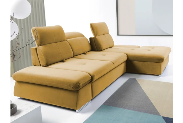 Komfortní rohová sedací souprava s otomanem vpravo zaujme moderním zaobleným designem. Největší předností jsou funkce polohování sedačky – díky nim si snadno přizpůsobíte každodenní pohodlí podle vaší aktuální potřeby. Oblíbíte si funkce polohování sedáku, polohování horních opěrek a polohování bočních područek. Rozkládací funkci na lůžko nebo úložný prostor naopak oceníte kvůli praktičnosti. Sedačka je očalouněna odolnou látkou v barvě hořčicová žlutá, která je velmi příjemná na dotek.