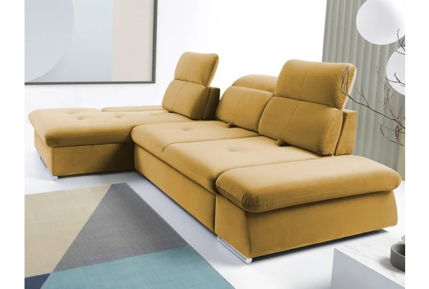 Komfortní rohová sedací souprava s otomanem vlevo zaujme moderním zaobleným designem. Největší předností jsou funkce polohování sedačky – díky nim si snadno přizpůsobíte každodenní pohodlí podle vaší aktuální potřeby. Oblíbíte si funkce polohování sedáku, polohování horních opěrek a polohování bočních područek. Rozkládací funkci na lůžko nebo úložný prostor naopak oceníte kvůli praktičnosti. Sedačka je očalouněna odolnou látkou v barvě hořčicová žlutá, která je velmi příjemná na dotek.