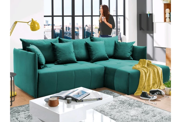 Rohová sedací souprava s atraktivním proševem a mnoha polštáři působí útulně. Očalouněna kvalitní látkou v lesklé optice tmavě zeleného sametu. Rozměrově ideální téměř do každého prostoru. Sami si určíte, zda chcete umístít otoman na pravou nebo levou stranu sedačky. Včetně praktické rozkládací funkce na lůžko i úložného prostoru pod sedákem.