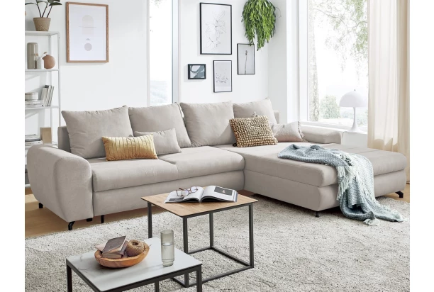 Atraktivní rohová sedací souprava se zaoblenými tvary nabízí příjemně měkký styl sezení pro Váš každodenní komfort. Očalouněna látkou v barvě světle béžová. Další přidanou hodnotou je praktický úložný prostor a navíc rozkládací funkce – díky ní se sedačka snadno promění na příležitostné lůžko třeba pro návštěvu. Díky univerzálně řešené konstrukci lze sedačku sestavit jako pravý anebo levý roh, respektive s otomanem na pravé anebo levé straně – sedačka se tak lépe přizpůsobí prostorovým možnostem Vašeho obýváku.