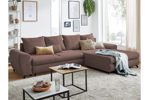 Atraktivní rohová sedací souprava se zaoblenými tvary nabízí příjemně měkký styl sezení pro Váš každodenní komfort. Očalouněna látkou v barvě hnědá. Další přidanou hodnotou je praktický úložný prostor a navíc rozkládací funkce – díky ní se sedačka snadno promění na příležitostné lůžko třeba pro návštěvu. Díky univerzálně řešené konstrukci lze sedačku sestavit jako pravý anebo levý roh, respektive s otomanem na pravé anebo levé straně – sedačka se tak lépe přizpůsobí prostorovým možnostem Vašeho obýváku.