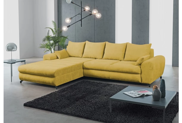 Atraktivní rohová sedací souprava se zaoblenými tvary nabízí příjemně měkký styl sezení pro Váš každodenní komfort. Očalouněna látkou v barvě žlutá. Další přidanou hodnotou je praktický úložný prostor a navíc rozkládací funkce – díky ní se sedačka snadno promění na příležitostné lůžko třeba pro návštěvu. Díky univerzálně řešené konstrukci lze sedačku sestavit jako pravý anebo levý roh, respektive s otomanem na pravé anebo levé straně – sedačka se tak lépe přizpůsobí prostorovým možnostem Vašeho obýváku.